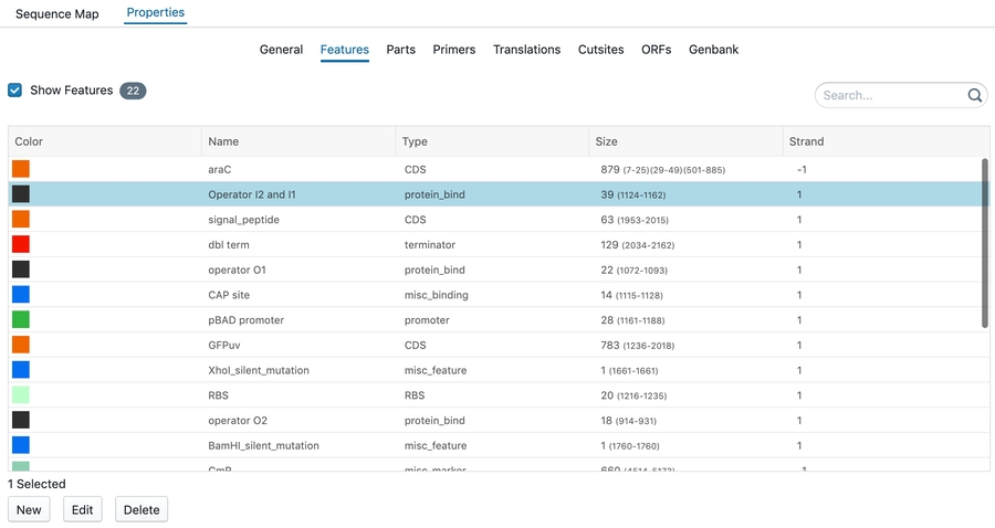 All features are summarized in the tab of Features. You have the option to change the color, name, type, strand. Select a sequence and right click to change, delete or create a feature. To reach this: